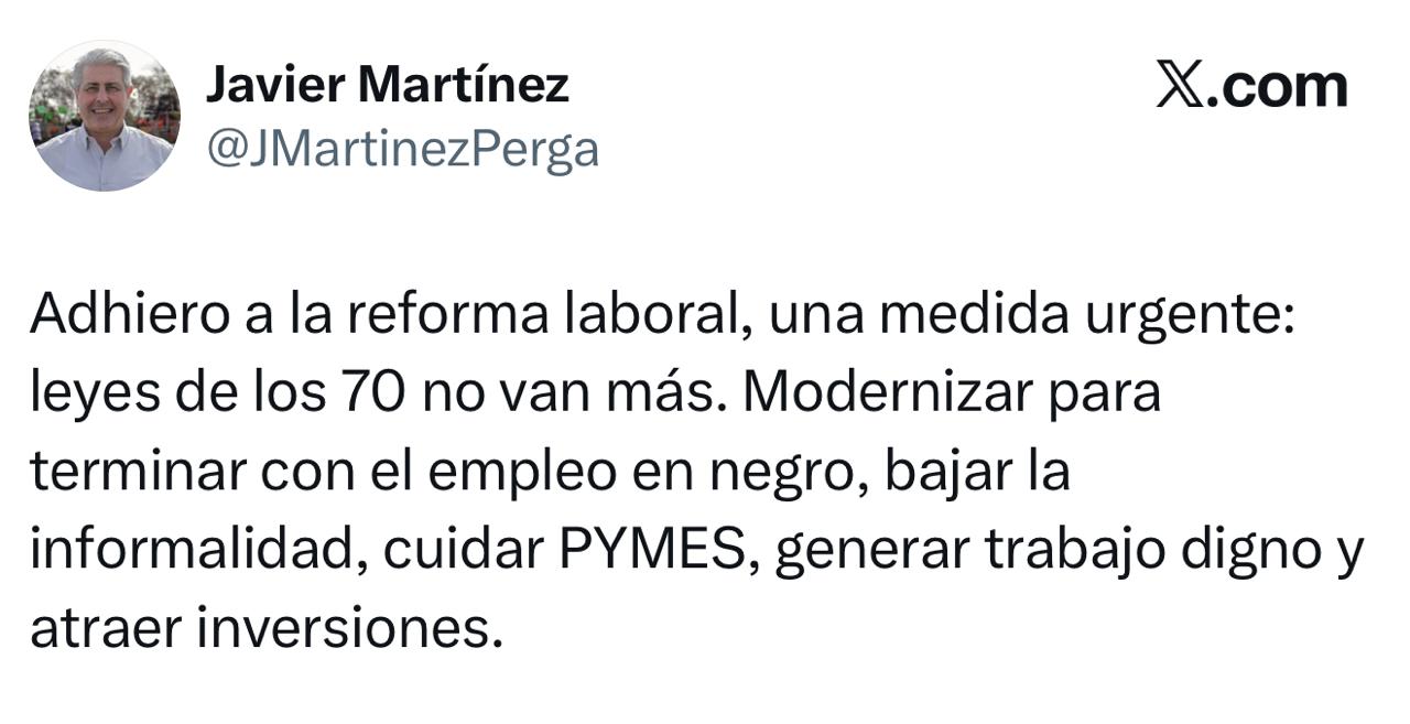 En un reciente comunicado a través de su cuenta oficial en X, el intendente de la ciudad de Pergamino, Javier Martínez, expresó su apoyo a la reforma laboral que se encuentra en debate en el ámbito nacional. La reforma, que propone cambios significativos en la legislación laboral, ha generado diversas opiniones tanto a favor como en contra dentro de los
